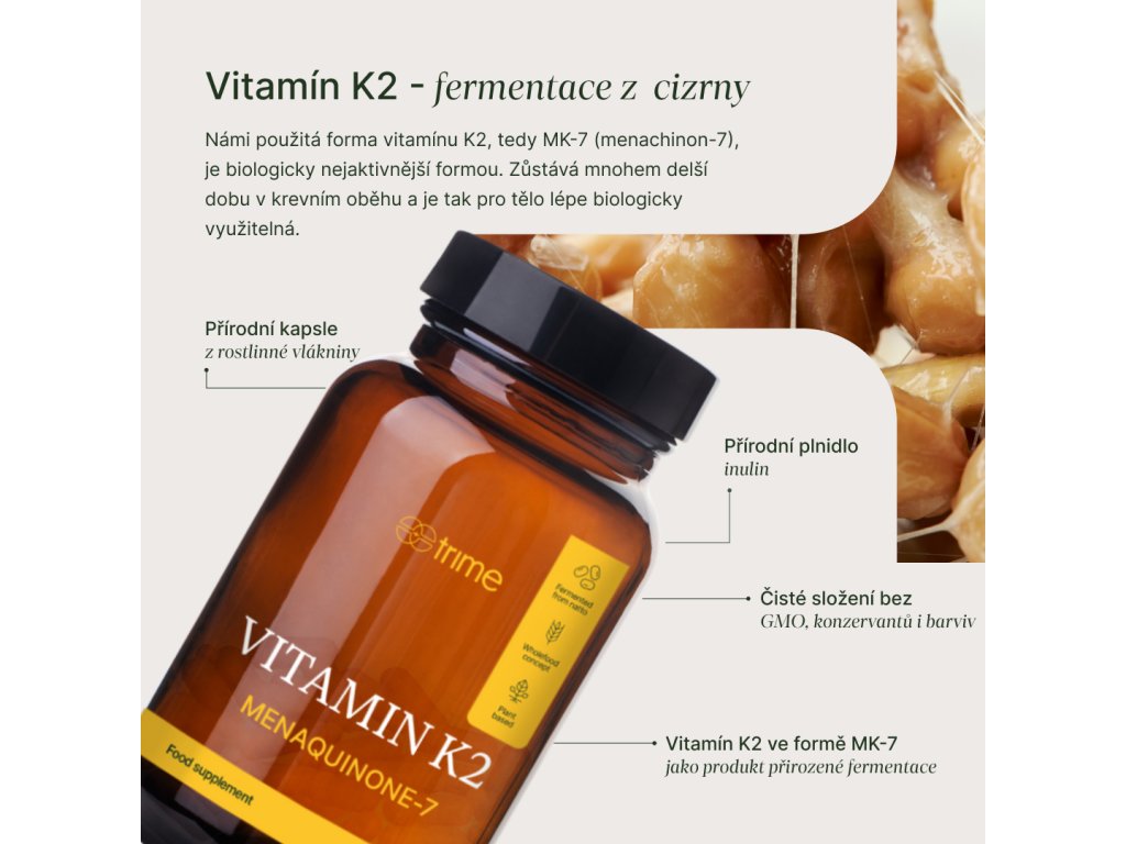 Námi použitá forma vitamínu K2, tedy MK-7 (menachinon-7), je biologicky nejaktivnější formou. Zůstává mnohem delší dobu v krevním oběhu a je tak pro tělo lépe biologicky využitelná. Vitamín K2 pomáhá předcházet vzniku kardiovaskulárních onemocnění a ovlivňuje metabolismus vápníku (směřuje ukládání vápníku do zubů a kostí a zamezuje tak jeho kumulaci v měkkých tkáních).